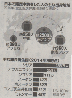毎日新聞の1月23日の報道で2013年に世界各国で難民と認定された人は21万人以上いるが、日本の同年の難民認定者は6人だ。人道的理由で在留を認めた人を含めても157人にとどまる。政府は一層の難民制度の改善に取り組むべきとのことです。